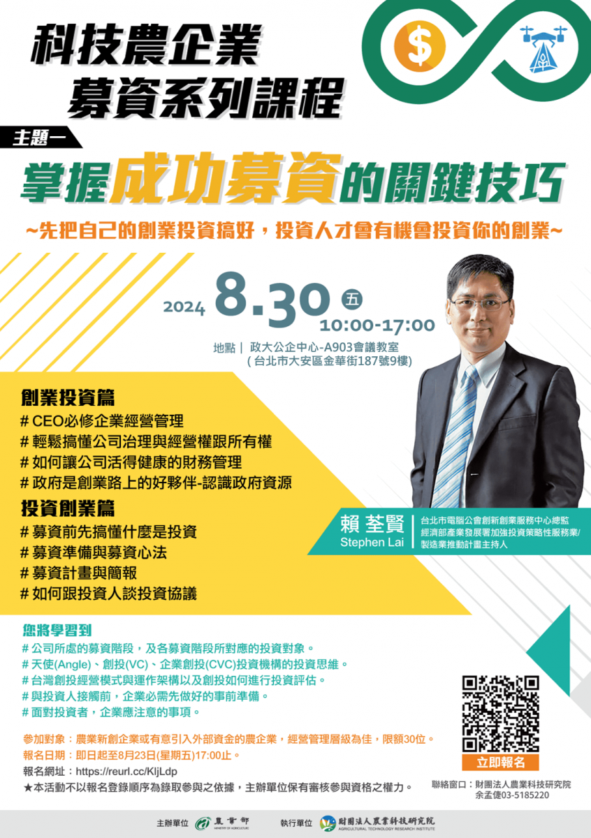【科技農企業募資系列課程】掌握成功募資的關鍵技巧,熱烈報名中!