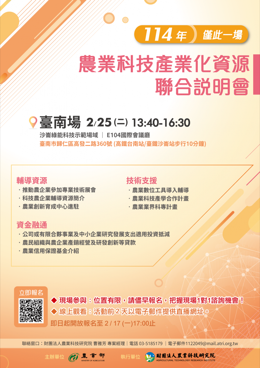 《114年農業科技產業化資源聯合說明會》報名開跑!