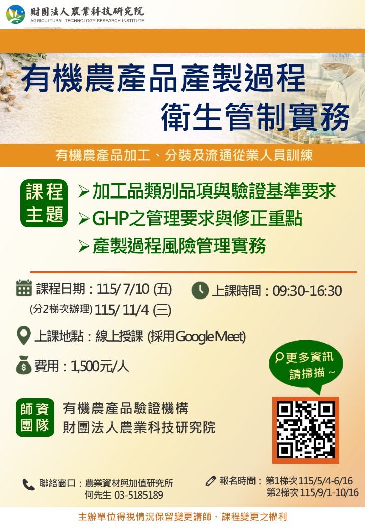產業學院課程~有機農產品產製過程衛生管制實務