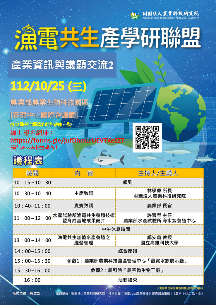 自漁電共生產學研聯盟成立以來,無論群組交流或活動觀摩等,均深受同好歡迎並熱烈參與支持,因此本院將於本(10)月25日假農業部農業科技園區管理中心舉辦「漁電共生產學研聯盟」第二次產業資訊與議題交流會,會中特別邀請農業部水產試驗所與國立高雄科技大學兩位學研界專家針對「台灣漁電共生產業推動狀況與經營管理」進行專題演講,會後並安排參觀本院進駐農業科技園區管理中心的「農業微生物工廠」與農業科技園區管理中心「觀賞水族動物展示廳」,機會十分難得,敬請踴躍出席!