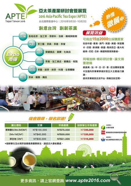 由台灣茶協會主辦的2016亞太暨兩岸茶產業研討會2016 Asia-Pacific Tea Expo(APTE 2016) ,本次大會以「創意臺灣創新茶業」為主題,針對茶業、健康、觀光文創三大領域進行討論,啟發多元學術討論為重點,現場將會以各種不同的會議形式進行,邀請海內外知名學者針對亞太暨兩岸茶產業發展及最新研究突破進行演講,包括研討會專題演講,主題演講,口頭論文發表,壁報論文、茶創競賽及展覽等方式辦理;同時讓與會者可以見識全世界來自各個不同角落的學術應用、產業交流與經驗分享。